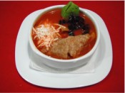 con trozos de aguacate, chicharrón, chile pasilla, crema y queso blanco